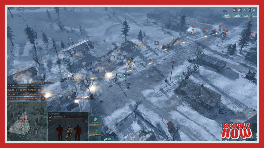 Esa densidad táctica también se apoya en una relación bastante física con las unidades. Los vehículos no son abstracciones blindadas que simplemente pierden puntos de vida. Sufren daños específicos, quedan inutilizados, arden, pierden movilidad o capacidad ofensiva. La infantería, por su parte, no transmite la limpieza geométrica de otros RTS más legibles, sino algo más desprolijo y más vulnerable. Esa fricción le da al campo de batalla una crudeza apropiada para el universo que adapta.